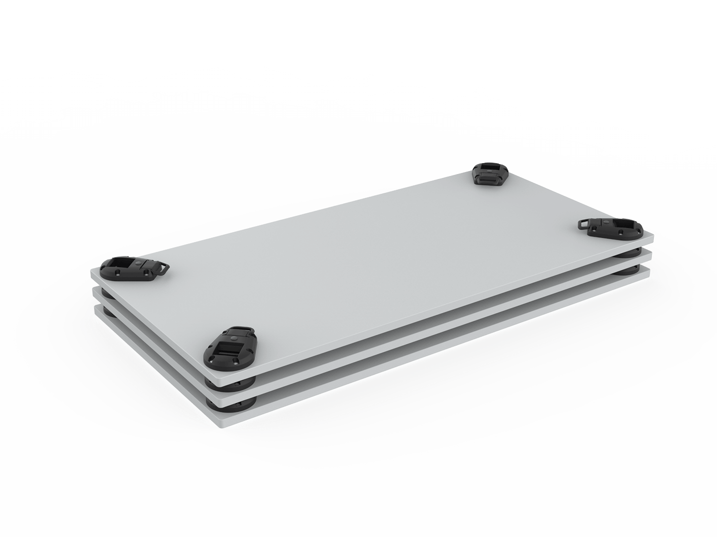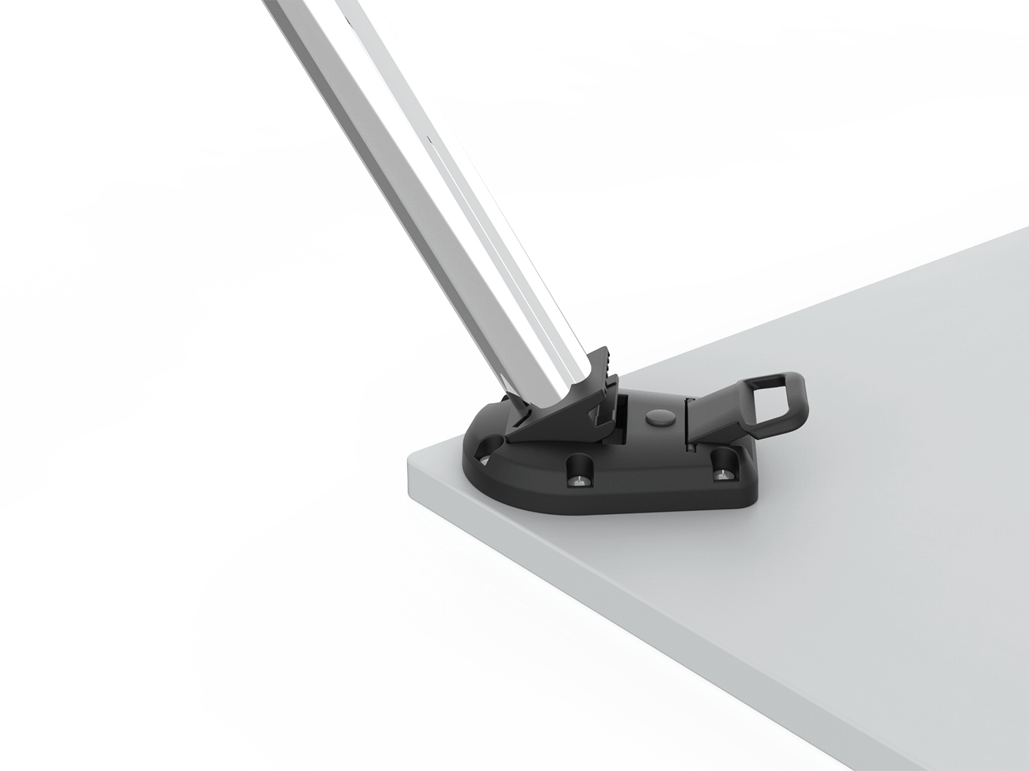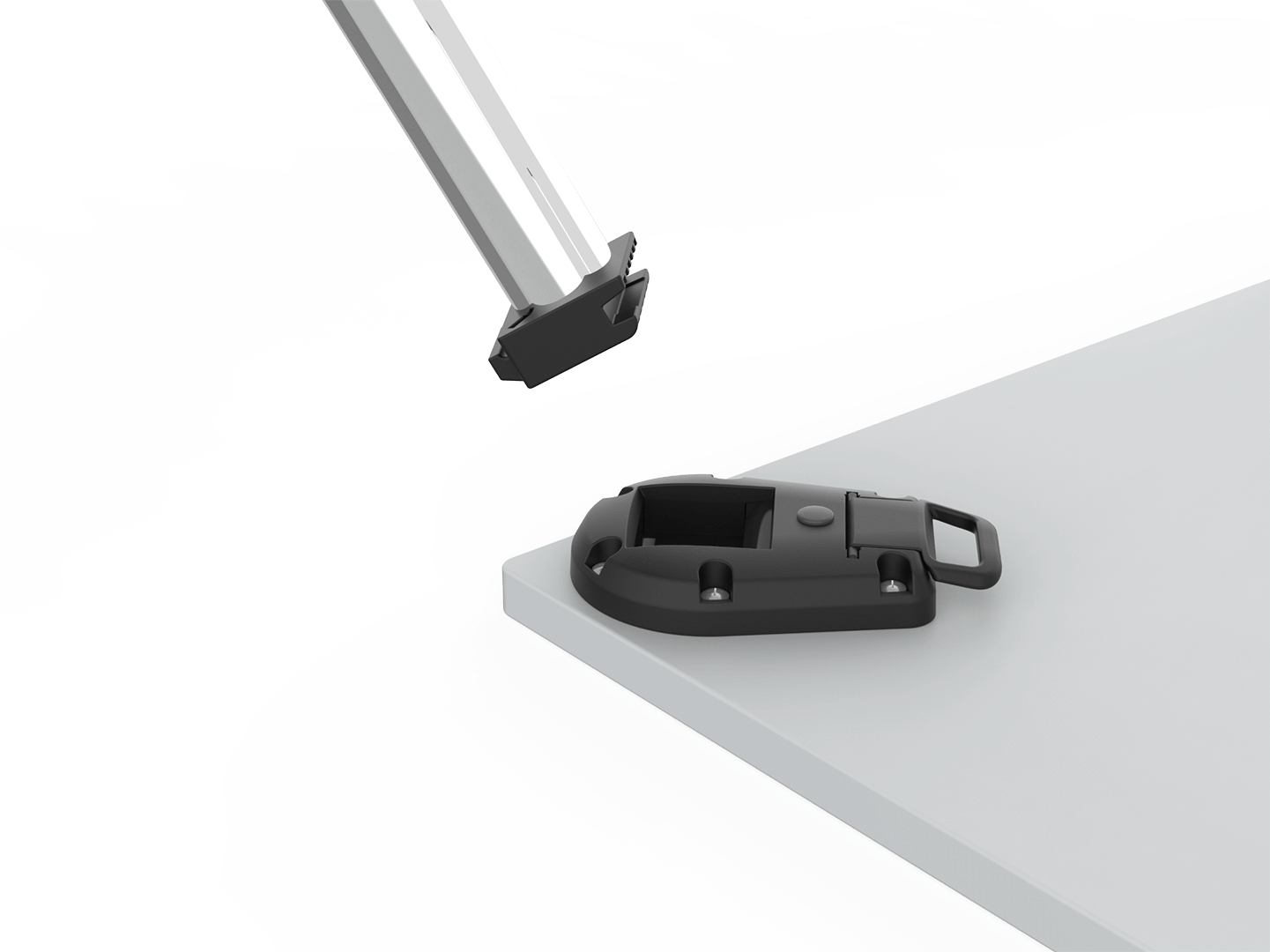 Der Tischadapter TAKE OFF mit Schnellverschluss bietet eine äußerst benutzerfreundliche Bedienung. Mit einem ergonomischen Hebel lässt sich das Tischbein einfach abnehmen, während die Befestigung durch das einfache Einsetzen erfolgt. Dieses System ist für alle Tischformen geeignet und ermöglicht eine freie Positionierung. Ein besonderes Merkmal ist die geringe Stapelhöhe, die durch einen integrierten Stapelpuffer noch weiter optimiert wird. Der Adapter ist für alle Tischbeine aller Formen bis zu 60 mm geeignet.