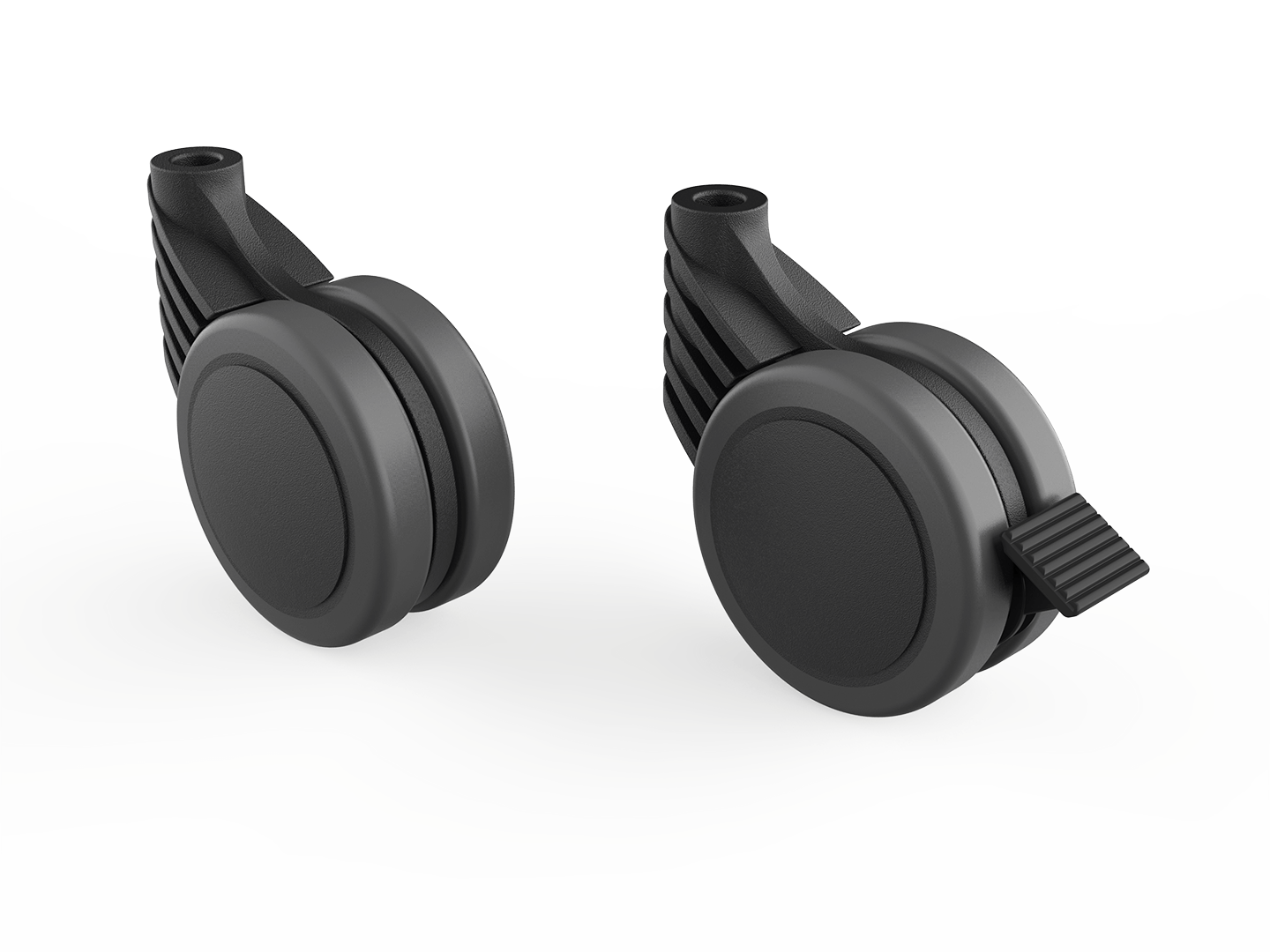 Doppellenkrolle Ø 75 mm aus Polyamid, mit harter oder weicher Lauffläche, mit oder ohne Feststeller.