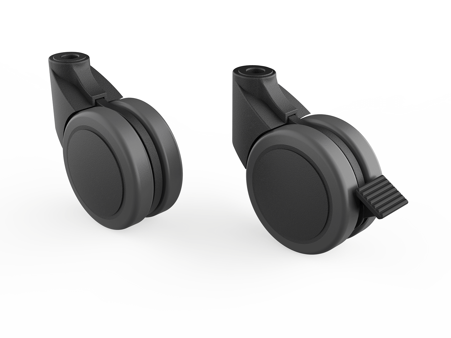 Doppellenkrolle Ø 75 mm aus Polyamid, mit harter oder weicher Lauffläche, mit oder ohne Feststeller.