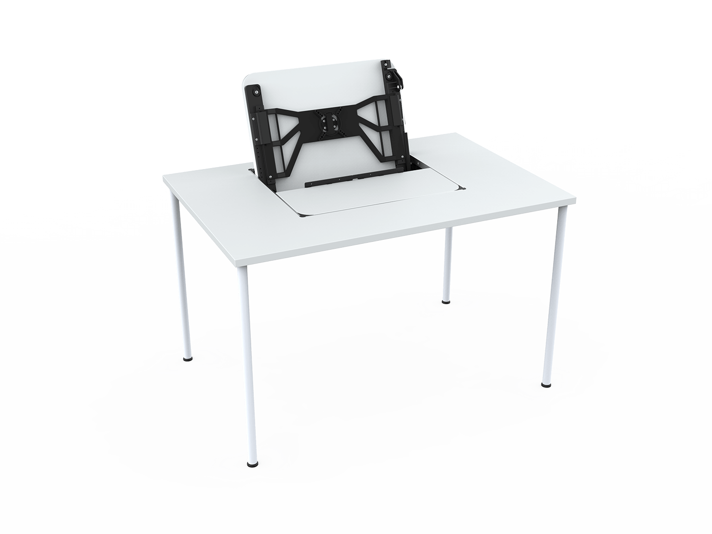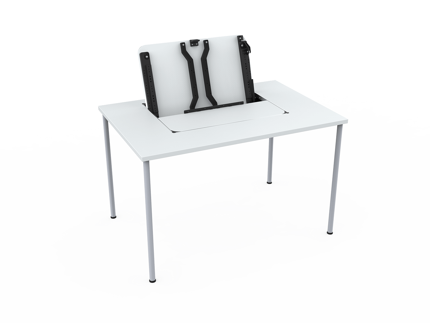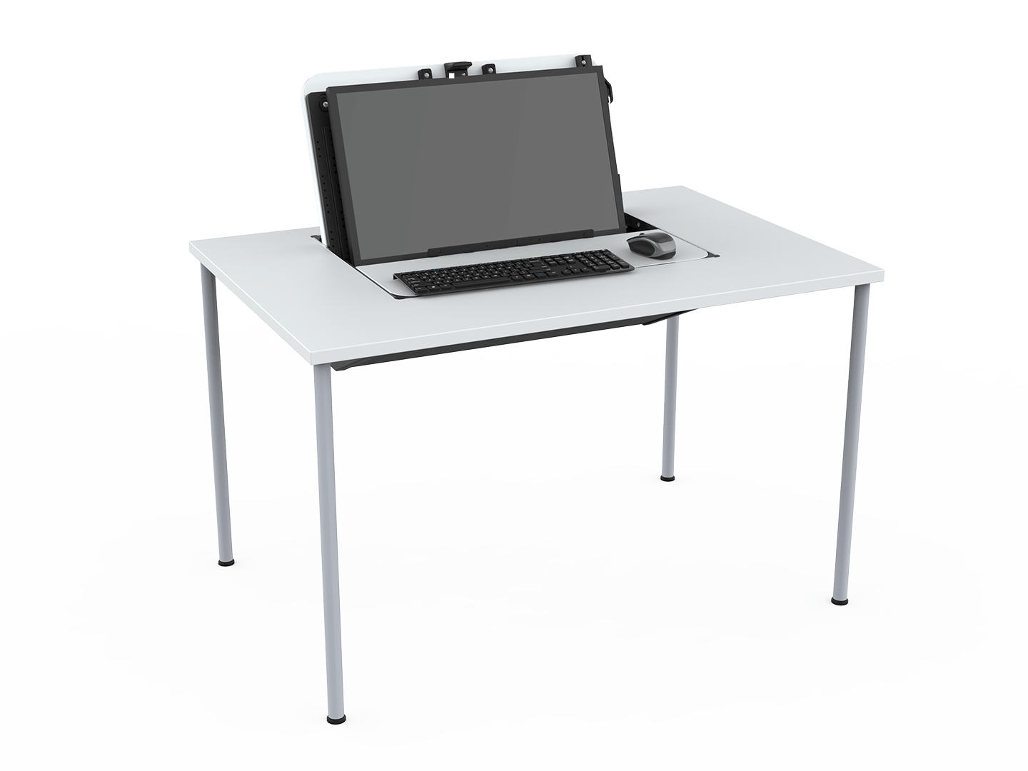 Ideal für Behörden, Schulen, Hörsäle, öffentliche Gebäude und Rezeptionen – die duale Nutzung eines Schreibtisches sowohl für »normale« Tätigkeiten wie auch als PC-Arbeitstisch. Die Tischplatte wird ausgeschnitten und das Gehäuse montiert. In geschlossenem Zustand steht die gesamte Arbeitsfläche zur Verfügung.