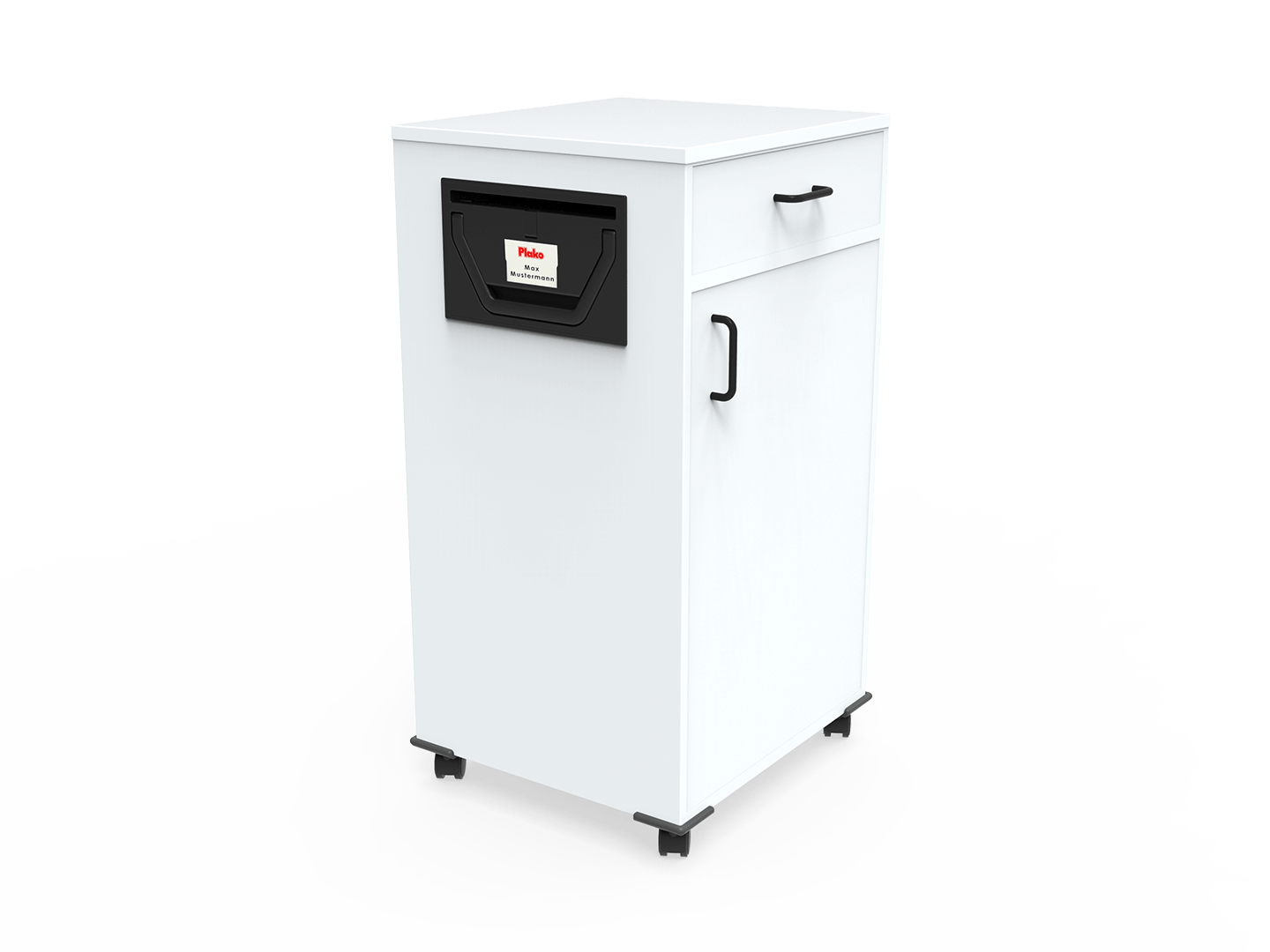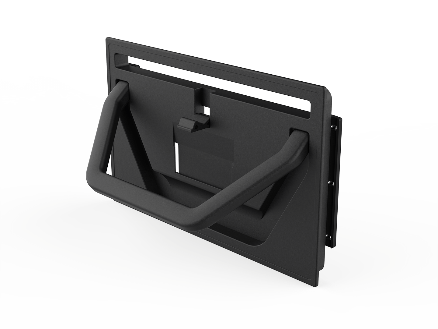 Funktionsbeschlag mit integriertem Klappgriff, Briefschlitz, Garderobenhaken und Namensschild.